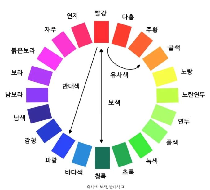 - 보색 (Complementary Colors): 색상환에서 서로 반대편에 위치한 색상으로, 강렬한 대비를 제공합니다. 예: 빨강 ↔ 초록.