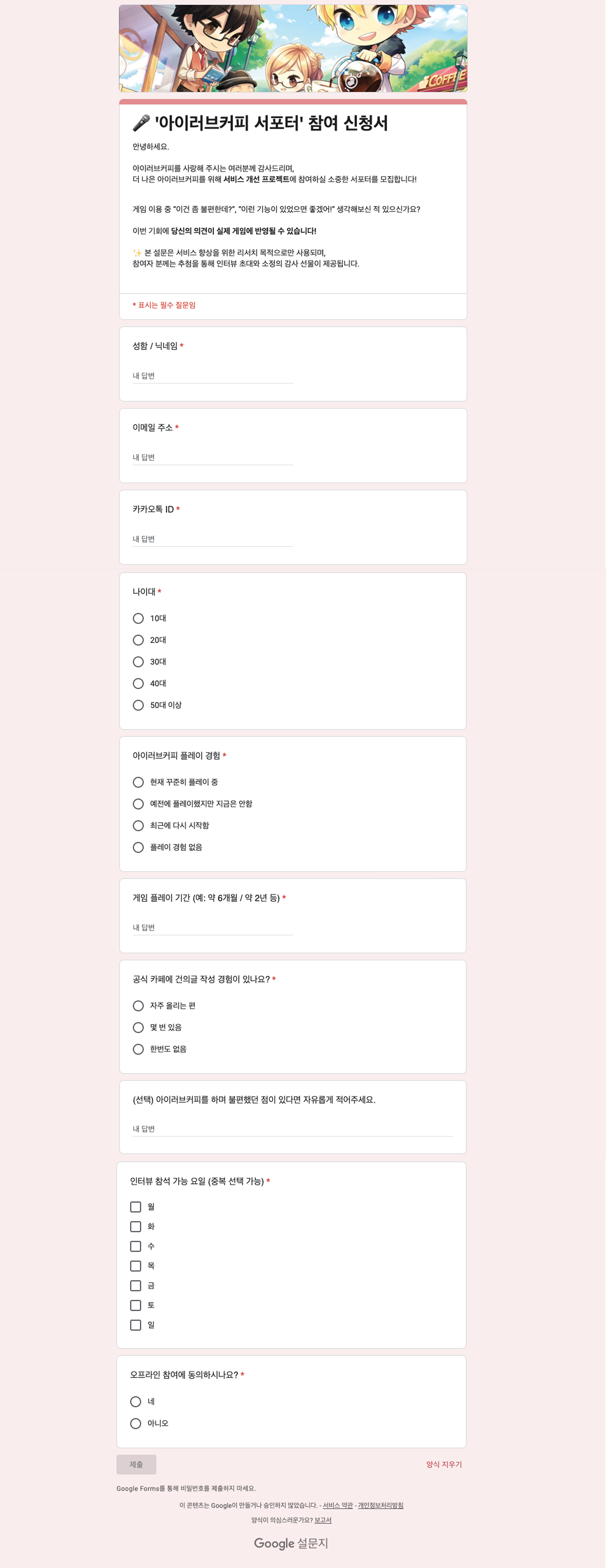 - [디자인부트캠프] DAY 25: FGI(Focus Group Interview) 기획안(’아이러브커피’ UX/UI 개선 목표) / 참여자 모집 구글 폼 제작 2025.04.09